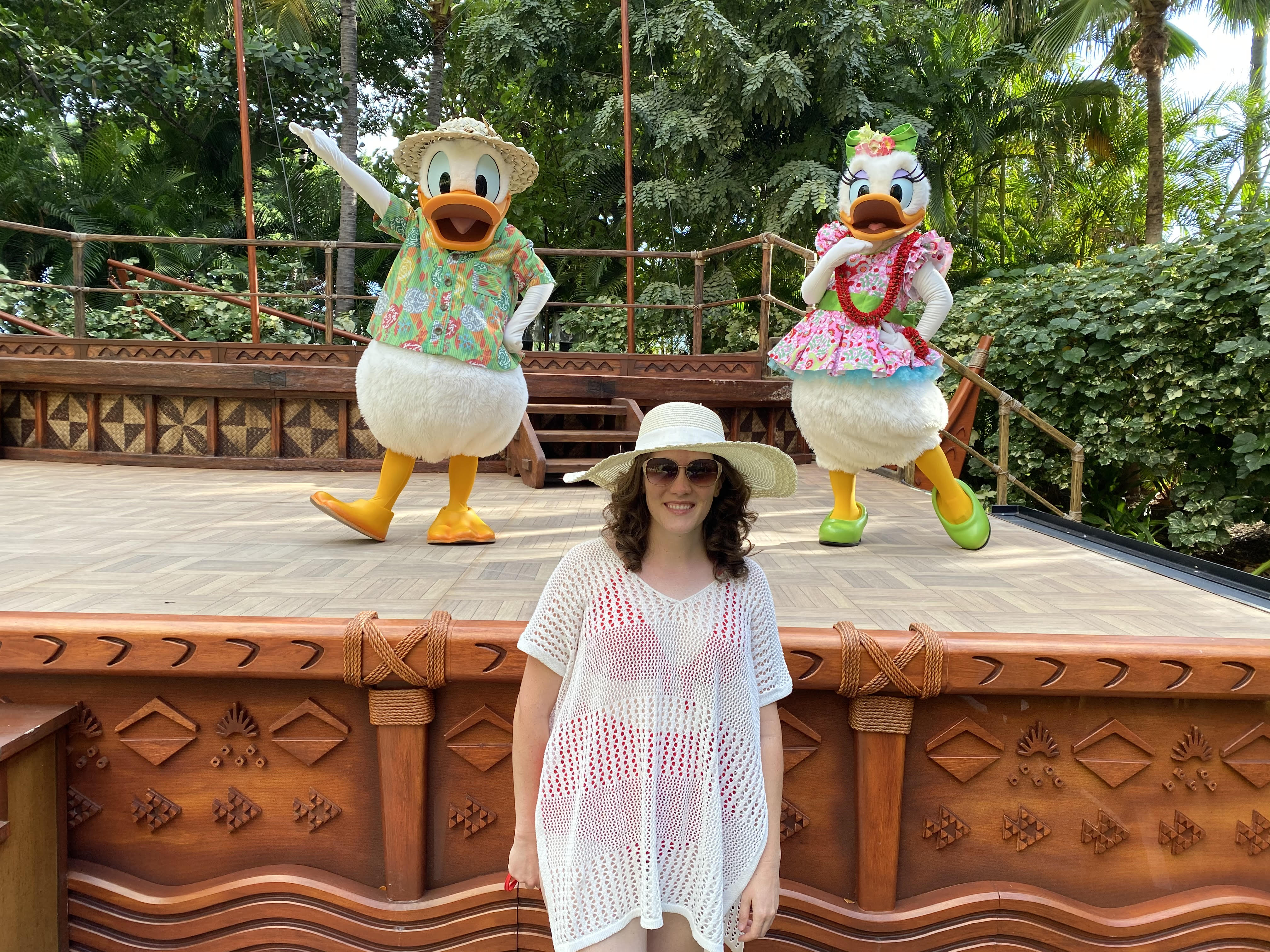 There are also other elements that make it feel like you’re being immersed in the Hawaiian culture. One of my favorites has been storytelling by ‘Uncle’ around the campfire (or pool during COVID season). He tells stories based on local folklore & I feel like through the simple act of listening to a story, I learned so much about ancient Hawaiian culture. We also really enjoyed the Menehune Adventure game. For this, you can check out a tablet from the Community Hall & ‘Aunty’ takes you on an adventure throughout the gardens & pool area of the resort. Not only does the game allow you to do cool things (like send fire out of a volcano or drop a waterfall into one of the pools), it also helps you to get a feel for some of the local culture. Another of my favorites is all of the live music you can find throughout the resort. The last time we were there, they weren’t doing their luau (which by the way, was awesome the first time we got to go to Aulani), but on the weekend, they had ‘Aunty’ singing Hawaiian songs & someone dancing with her on the lawn while we waited to meet the characters. It’s simple things like that which contribute to the overall celebration of the Hawaiian culture as part of the resort’s story.