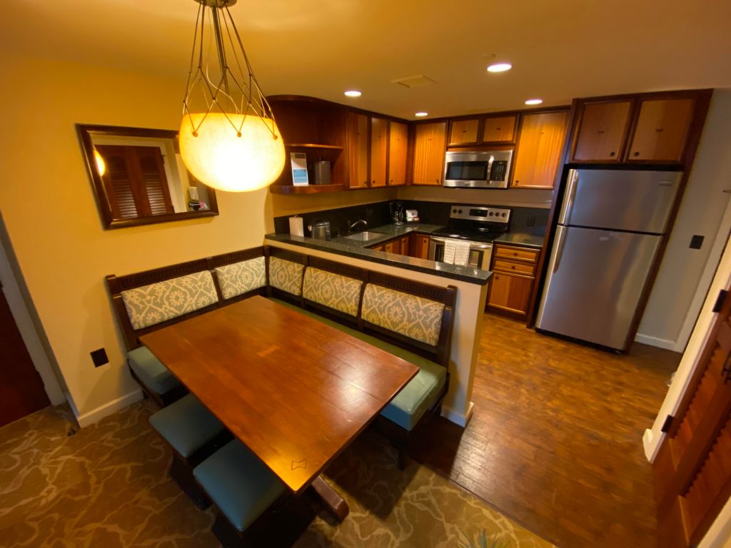Speaking of staying there, there are a number of different room types available at Aulani to accommodate any family. Aulani is considered a Disney Vacation Club (DVC) property. That means the people who have bought into Disney’s timeshare program can stay there using their membership. However, you DO NOT need to be a DVC member to stay there. ANYONE can book a room at Aulani & enjoy the resort. Room types range anywhere from a traditional hotel-style standard room with two queen-sized beds, to a three-bedroom villa with full kitchen. We have stayed in both a standard room & a 1-bedroom villa with full kitchen. Both suited our needs just fine for the different trips we took. We did enjoy having a full kitchen with the villa because we could save some money by cooking some of our own meals, but the standard room has a mini-fridge so you can keep some things in there too. Whatever type of room you stay in, they are very nice & I’m sure you will be very comfortable.