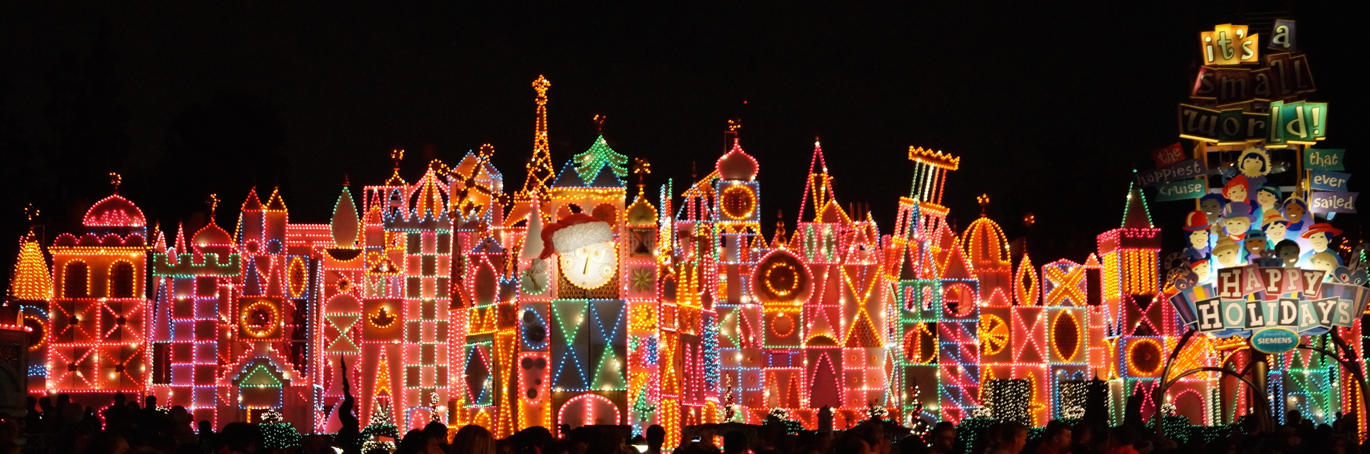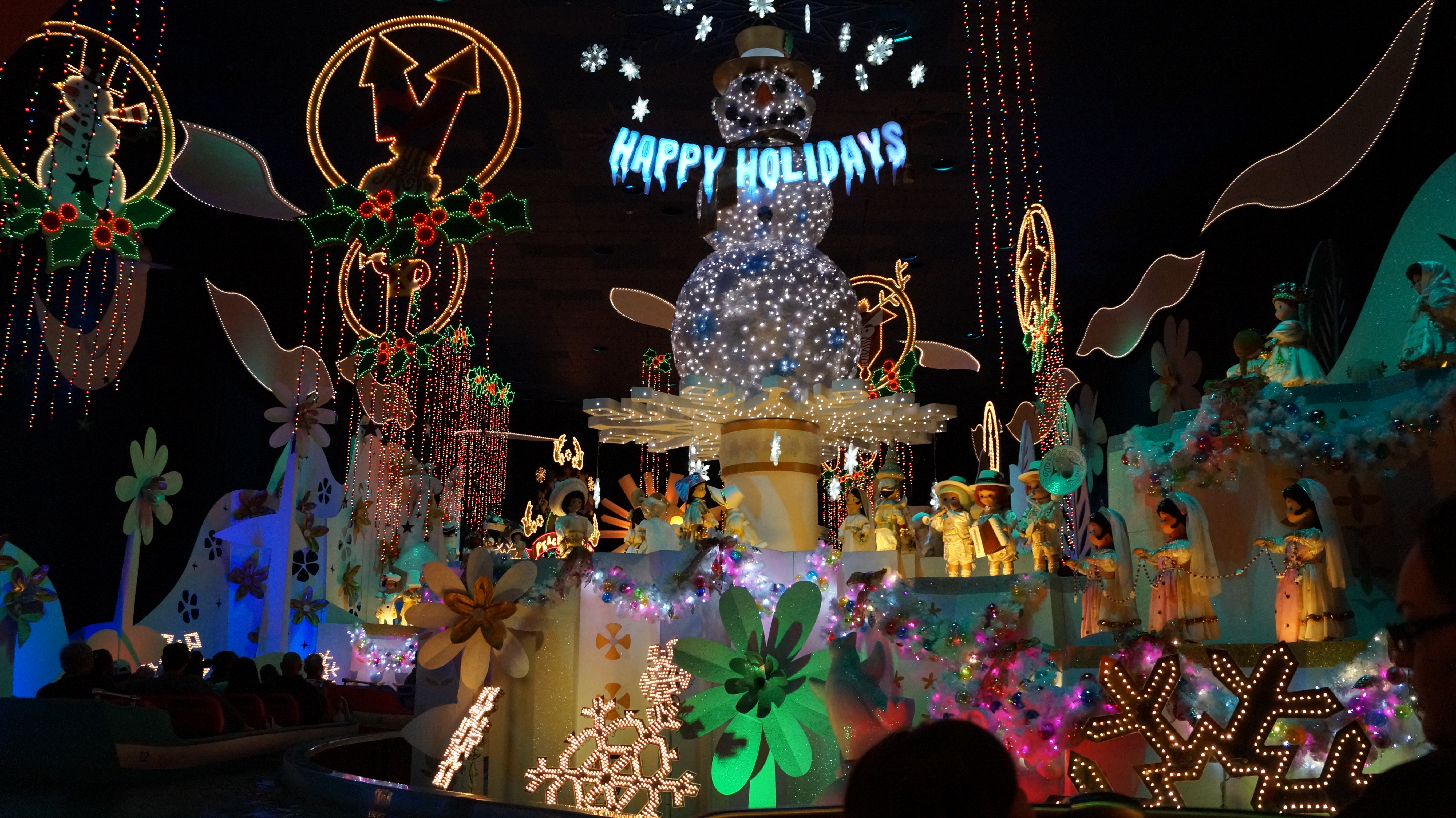One of the biggest icons of the Disneyland Park is transformed into one of the happiest attractions ever created. They have done this by the explosion of decorations in and around every inch of this attraction. Additionally, they have created a medley of songs using Christmas carols from around the world. We usually only ride this attraction once each visit but with things made up for the holidays, we find ourselves riding in several times. There is just so much to see and enjoy. One of the things we like to do while riding the attraction is to find all the Disney characters mixed within the 300 plus dolls. Can you find them all? The characters you will find are Peter Pan, Tinker Bell, Cinderella, Pinocchio, Jiminy Cricket, Aladdin, Jasmine, The Three Caballeros, Ariel, Flounder, Lilo, Stitch, Woody, Jessies and Bullseye.